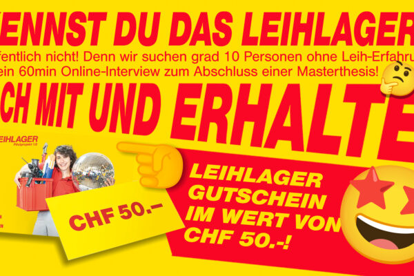 Zum Abschluss einer Masterthesis an der FHNW im Bereich Angewandte Psychologie suchen wir 10 Personen ohne Leih-Erfahrung für ein 60min Online-Interview! Jede:r Teilnehmende erhält als Entlöhnung einen Leihlager Gutschein im Wert von CHF 50.-. Wenn du also jemand bist, der/die noch nie geliehen hat, dann mach unbedingt mit! Wenn du jemanden kennst, der/die nichts von uns weiss und einfach Bock auf ein Interview & Gutschein hat, erzähl ihm/ihr sehr gerne von dieser Umfrage! 🙂